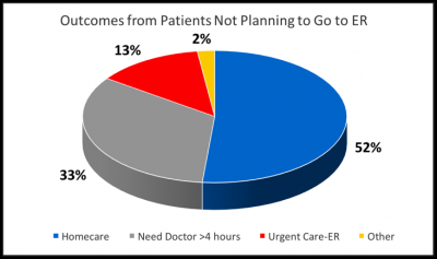 From the 11,000 callers surveyed, a little over 7,900 patients told us that they were not planning to go to the ER. A full 87% of callers were correct in their self-assessment that they did not have an emergency. From simple medication questions and general information requests to fevers and colds, many of the concerns were of a non-urgent nature and callers were given home care advice and no additional care needed (52%), and in some cases callers were instructed to follow up with their doctor or a telemedicine doctor when appropriate (33%).